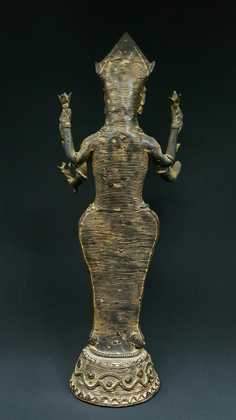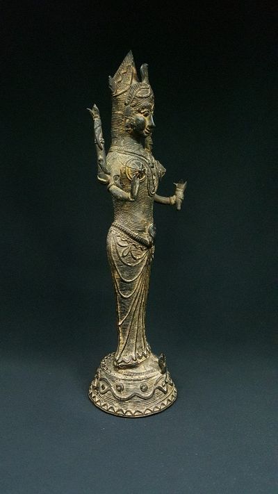 Habituellement, Lakshmi est représentée sur un lotus, mais sur cette statuette un serpent entoure ses pieds.