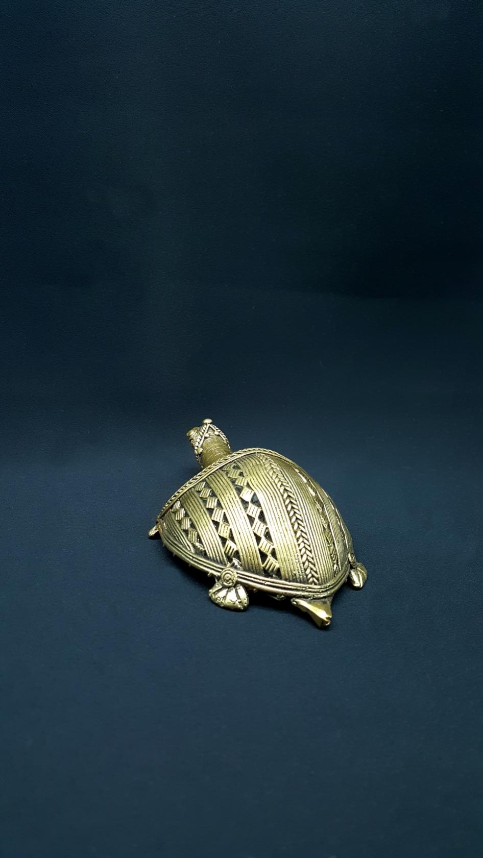 Magnifique tortue au long cou lui donnant une grâce divine. La carapace est richement décorée de motifs géométriques souvent utilisés dans l’art Dokra. Sa tête est aussi ornée d’un diadème renforçant sa nature divine.