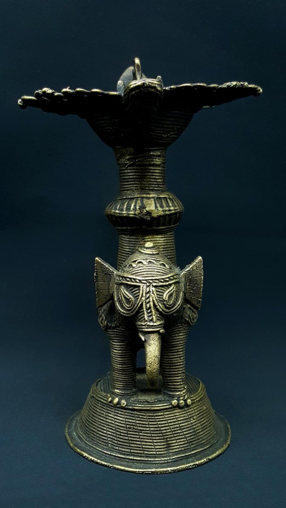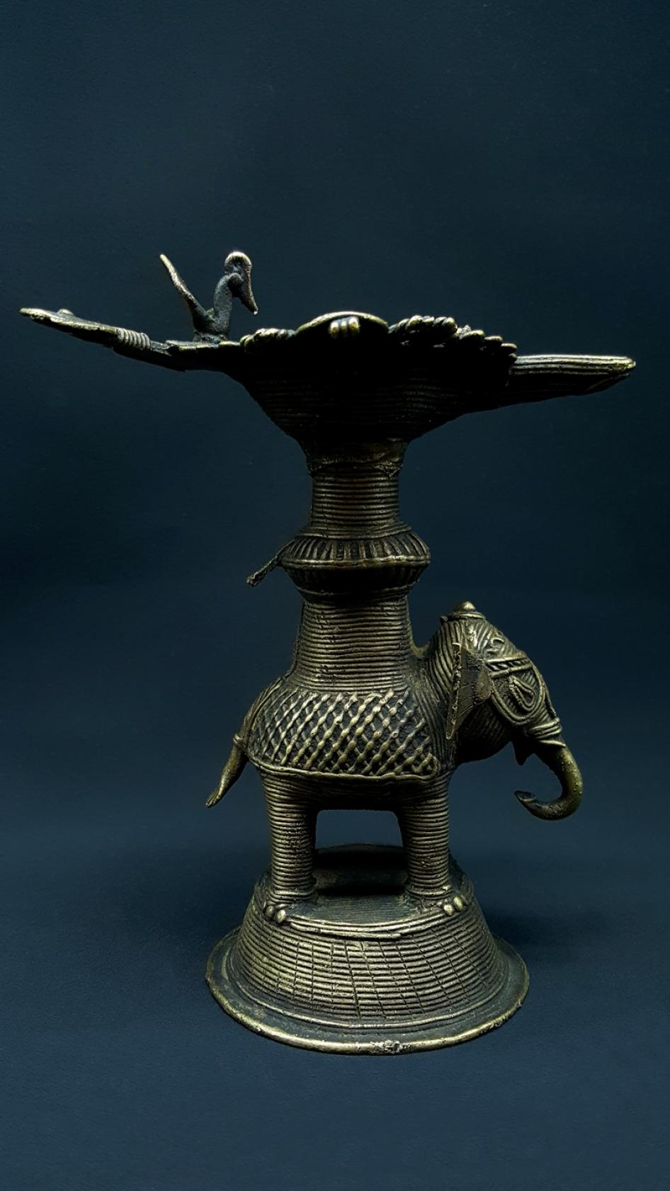 L’éléphant Deepak un superbe éléphant lampe à huile réalisé en pur style traditionnel Dokra : des formes épurées, traditionnelles, rustiques où l’on reconnaît aisément la technique de la cire perdue utilisant des fils pour le modelage. L’artiste a réalisé un travail tout en finesse que ce soit au niveau de l’éléphant que du deepak.