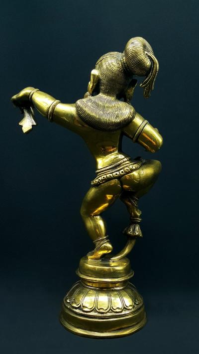 La position des bras est gracieuse, elle révèle une parfaite maîtrise de la danse, un profond équilibre et une grâce qui peut contraster avec l’aspect plutôt massif du corps de Krishna.